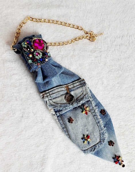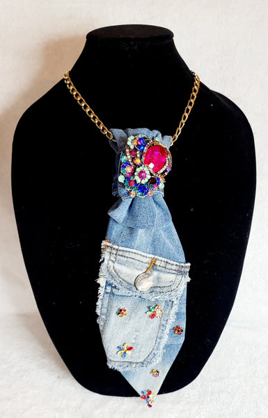 Multi colored gems denim junktie, Embellished with multi colored brooch